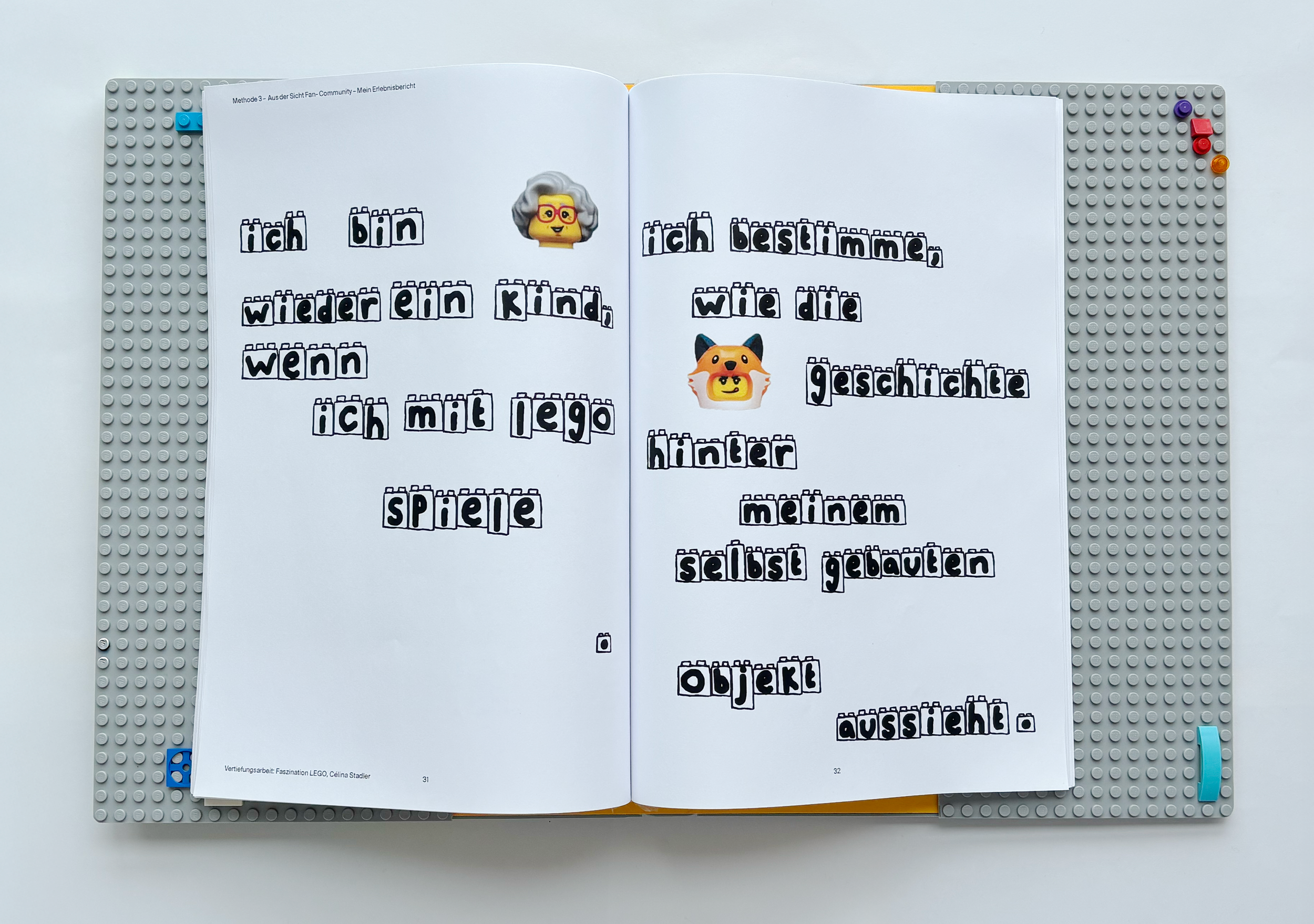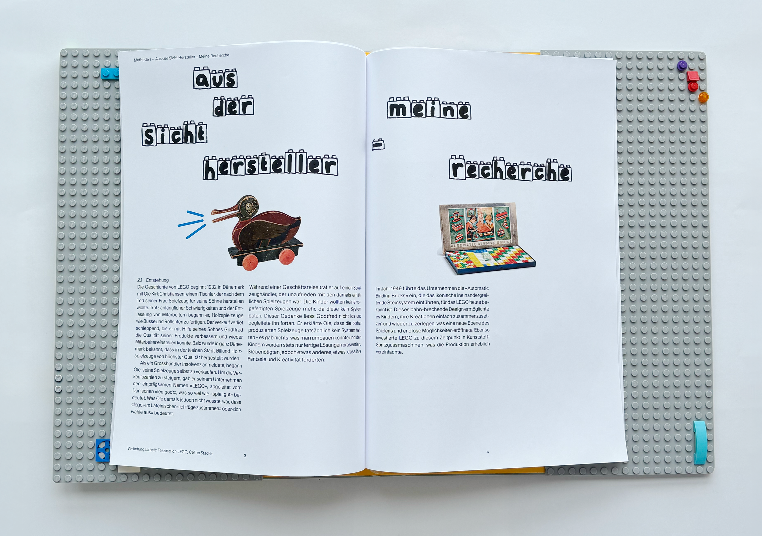 Für meine Vertiefungsarbeit an der Schule habe ich mich mit dem Thema Faszination LEGO beschäftigt. Um herauszufinden, was der Ursprung dieser Faszination an Lego ist, habe ich drei Methoden gewählt: eine ausführliche Recherche, eine Umfrage und einen Erlebnisbericht über meinen Besuch im LEGOLAND.